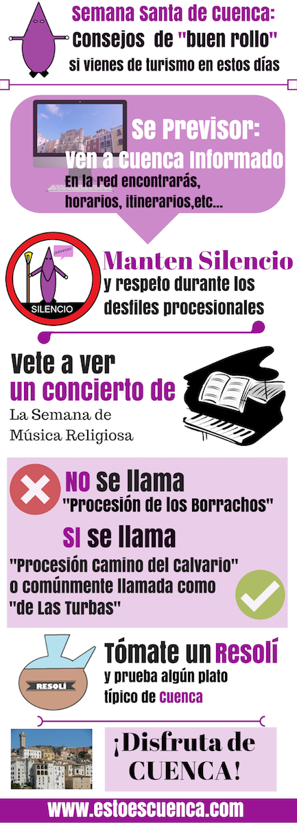 Esta entrada también le va a venir bien a algún conquense despistado o visitante que repite en la Semana Santa de Cuenca. Lo primero de todo es una infografía que he elaborado a modo de resumen con todos los consejos que vais a ver en el post: